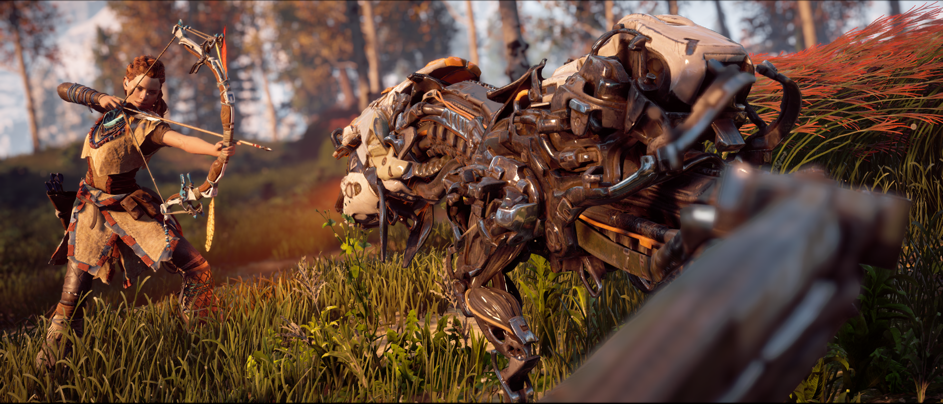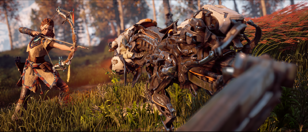 Saya bertaruh siapa pun dapat mengatakan bahwa saya telah mengambil foto yang lebih baik daripada foto ini, dan bahwa Hardisk penuh dengan foto Horizon Zero Dawn yang lebih baik, tetapi ada sesuatu tentang komposisi bidikan ini yang membuat saya menyukainya setiap saat. Ada garis imajiner dari siku kanan Aloy yang melewati lengan, busur, dan anak panahnya, langsung ke wajah robosaur, lalu melengkung di sepanjang tulang belakang robot ke ekor dan keluar dari layar. Ini adalah garis yang dimulai dari kedalaman skenario tertentu dan kecepatan seperti bola melengkung ke latar depan dan seterusnya. Sebuah garis yang memberikan ritme, gerakan, dan kedalaman pada bidikan ini seperti beberapa kali saya bisa melakukannya. Bahkan pose Aloy berhasil menjadi plastis dan realistis sekaligus menciptakan garis lurus lain yang membentuk sudut 90° dengan garis imajiner tersebut di atas. Harmoni dan gerakan seperti itu sangat jarang, itulah mengapa menurut saya ini adalah salah satu bidikan aksi terbaik saya.